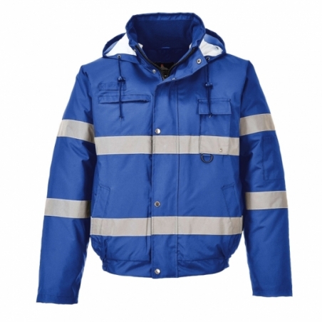 - Bardzo ciepła wodoodporna kurtka Bomber o stylowym kroju z naszytą taśmą ostrzegawczą. Posiada polarowe wykończenie kołnierza dzianinowe ściągacze na końcach rękawów kieszeń na narzędzia kaptur chowany w kołnierzu oraz dostęp do nadruku.