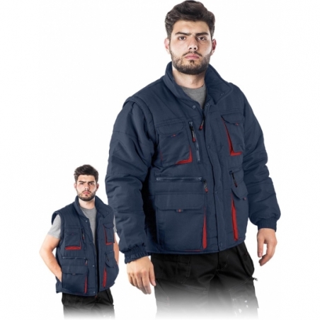 Kurtka zimowa z odpinanymi rękawami. - powłoka 100% poliester - wyściółka 100% poliester - podszewka 100% poliester - zapinana na suwak z dodatkowym zapięciem na napy - ośmiokieszeniowa, w tym cztery kieszenie na rzep i dwie na suwak - kieszeń od wewnątrz oraz dodatkowe kieszonki na zewnątrz na długopis - odpinane rękawy zwiększają funkcjonalność kurtki - ściągacz w rękawach - kolorowe wstawki przy kieszeniach - przedłużany tył kurtki chroni przed wiatrem i dodatkowo ogrzewa plecy - delikatne marszczenia po bokach na dole nad przedłużeniem zabezpieczają przed podwijaniem się materiału i dopasowują kurtkę do sylwetki użytkownika