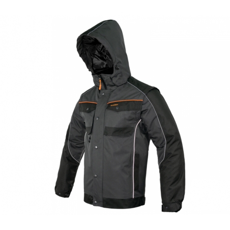 Ocieplana kurtka ochronna outdoor'owa wykonana z wodoodpornego materiału poliester 600D Oxford impregnowanego PU, poliestrowej ociepliny, od wewnątrz wykończona poliestrową podszewką pikowaną w pionowe pasy.