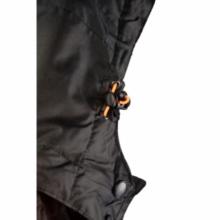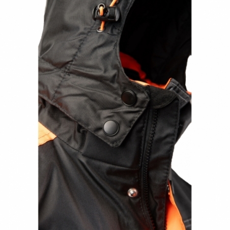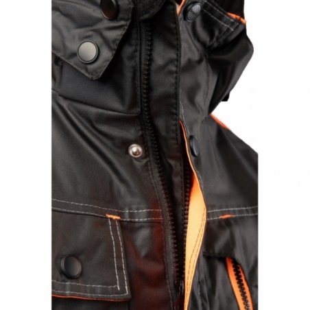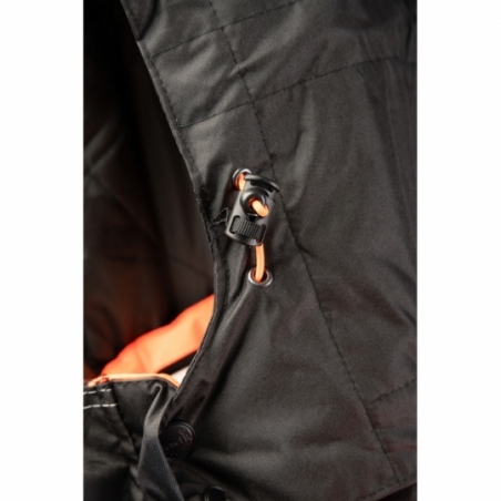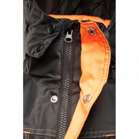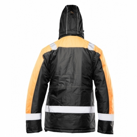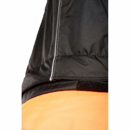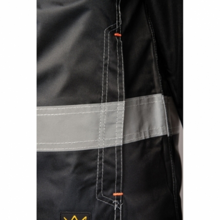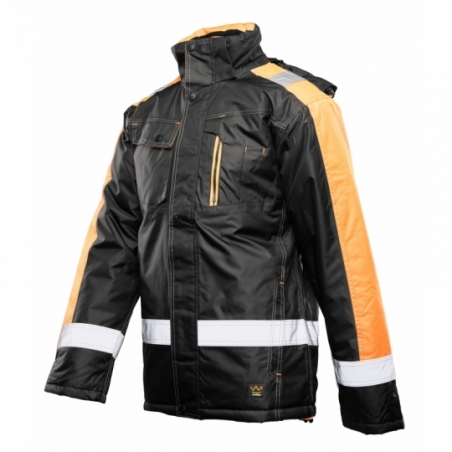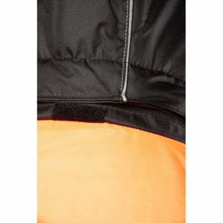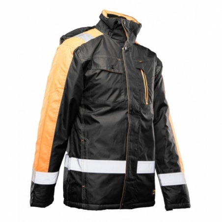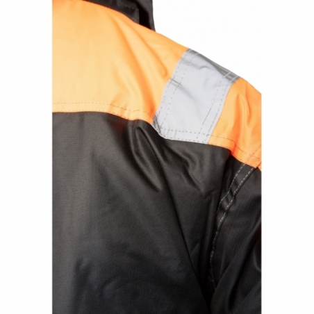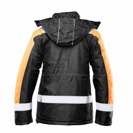 Wszyty dzianinowy ściągacz w mankietach oraz możliwość regulacji tęgości za pomocą gumek ściągających zapewniają idealne dopasowanie. Odpinany, regulowany i ocieplany kaptur chroni przed niekorzystnymi warunkami atmosferycznymi, a pasy odblaskowe i lamówki zwiększają widoczność i bezpieczeństwo po zmroku.