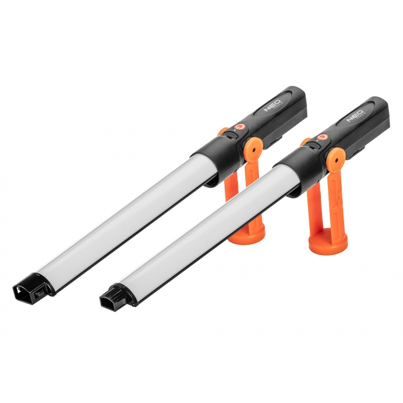 Lampa warsztatowa akumulatorowa Neo moc 2 x 4.5W, 2 x 350 lumenów, LED SMD, zasilanie 2 akumulatory 2200mAh 3.7V Li-ion (w zestawie), 6 magnesów w podstawach, obrotowe podstawy, 4000K, ładowarka USB 5V/1A (w zestawie), czas pracy 2h, czas ładowania 2h, rozkładana konstrukcja - długa lampa, dwie lampy oddzielnie. haki do powieszenia
