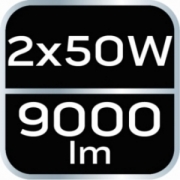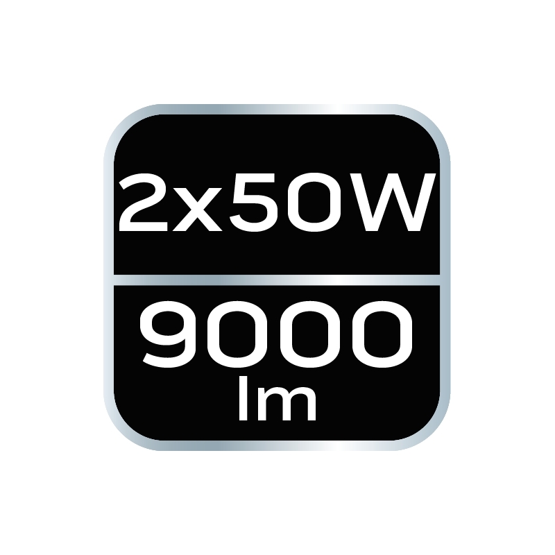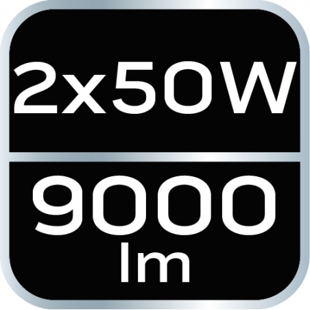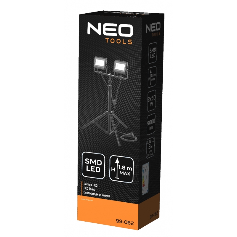 Reflektor pojedynczy NEO moc 2 x 50W, 9000 lumenów, 230V 50Hz, SMD LED, czas pracy 25 000h, 6500K, aluminiowy korpus, IP65, CRI Ra ≥ 80, kąt świecenia 120 stopni, ON/OFF ≥ 15 000 cykli, przewód z wtyczką 3m, temperatura pracy -25<>+45, współczynnik mocy >0.9, czas rozpalania do 60% <1s, statyw teleskopowy max 1.8