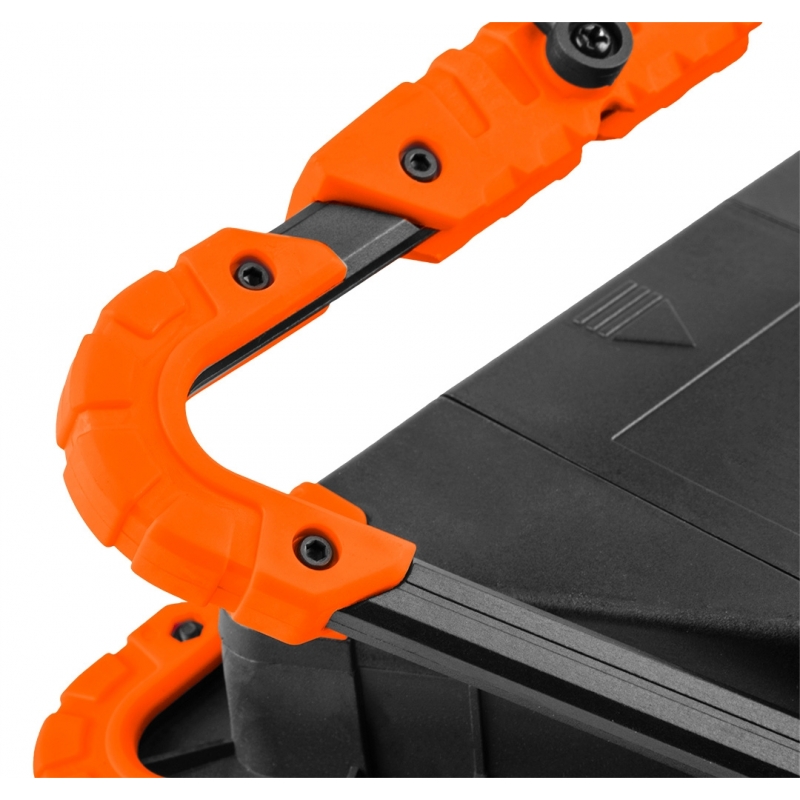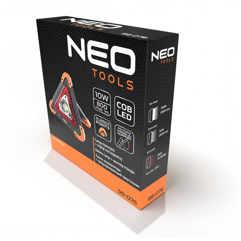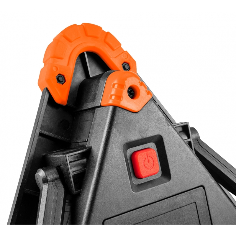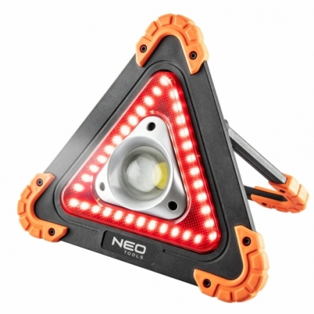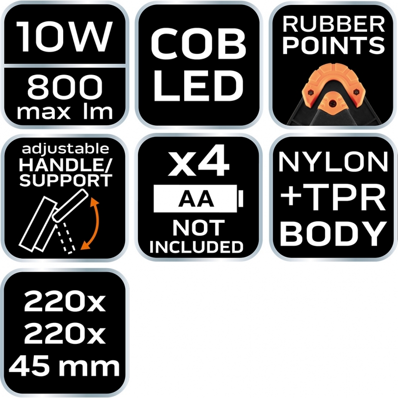Lampa bateryjna + trójkąt ostrzegawczy 2 w 1, 800lm, 10W, COB LED, korpus nylon+TPR, zabezpieczone gumą rogi, ruchome podparcie, zasilanie 4xAA (brak w zestawie), rozmiar 22x220x45mm, 3 funcje świecenia 100% białe światło, 50% białe światło, czerwony światło ostrzegawcze strobe