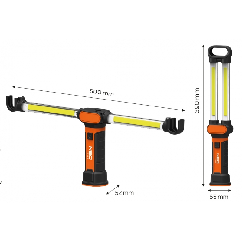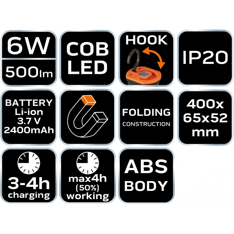 Lampa warsztatowa akumulatorowa 500 lm, 6W, COB LED, rozkładana konstrukcja, magnes, hak, akumulator li-ion 3.7V 2400mAh, materiał ABS, IP20, czas ładowania 3.5h, czas pracy 4h (na 50% mocy)