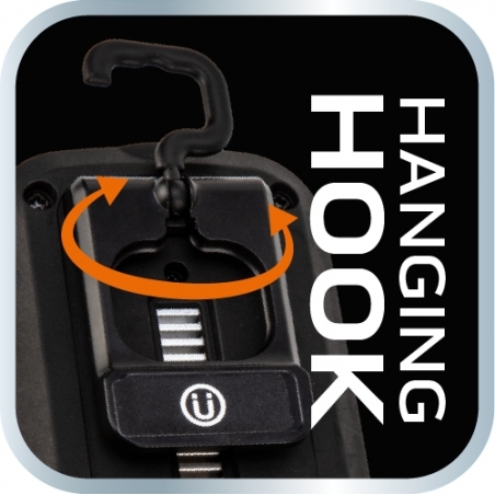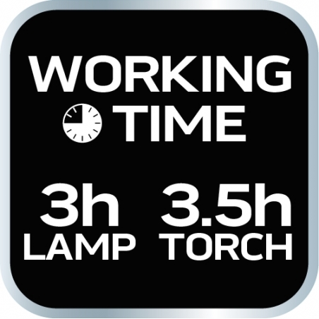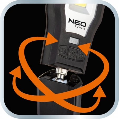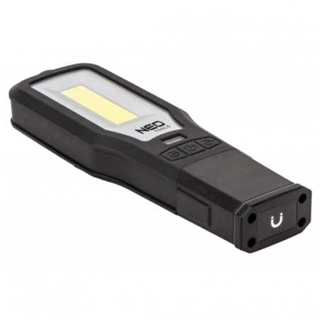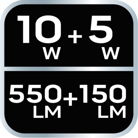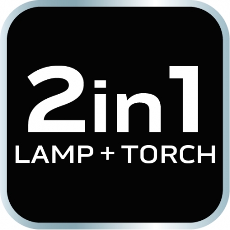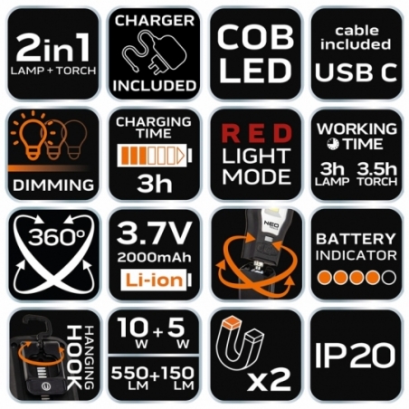 Lampa warsztatowa 550 lm i 10W, latarka 150lm i 5W, COB LED, baza, ładowarka 230V, funkcja ściemniania, czas ładowania 3h, czas pracy lampa 3h, czas pracy latarka 3.5h, funkcja czerwonego światła, głowica obrotowa 360 stopni, akumulator li-ion 3.7V 2000mAh, wskaźnik naładowania baterii, hak, 2 magnesy, IP20, power bank