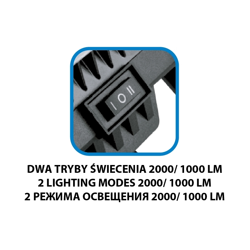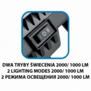 Lampa akumulatorowa LED 18 V Li-lon, dioda 20 W LED SMD, dwa tryby świecenia: 2000 i 1000 LM. Regulacja kąta nachylenia do maksymalnie 120°. Temperatura barwowa 6500K. Rękojeść typu soft grip foam EVA. Rekomendowana pojemność akumulatora to 4 Ah. Waga 1,63 kg.