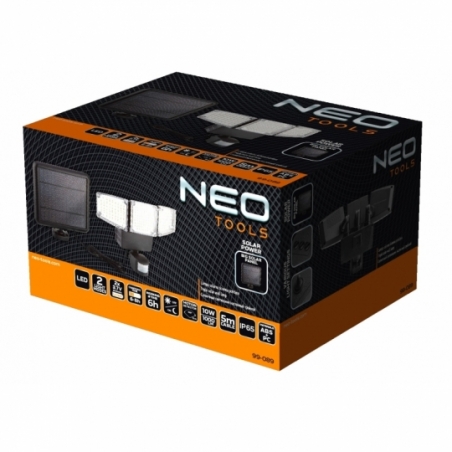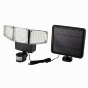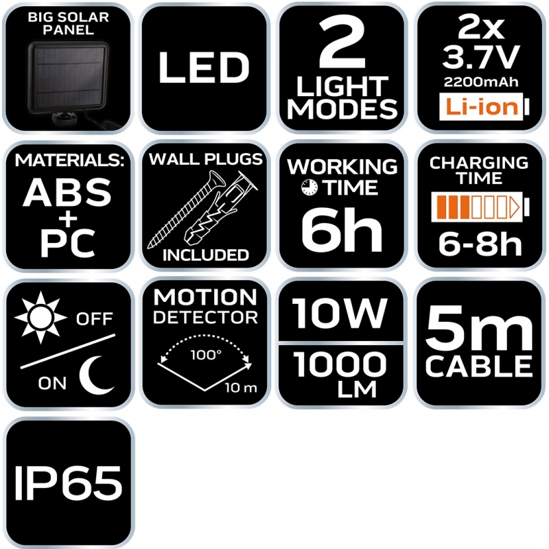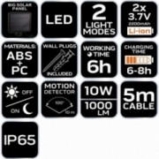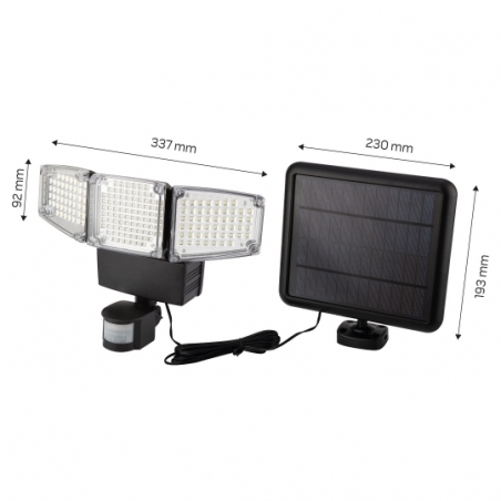 Lampa solarna ścienna potrójna LED, 1000 lm, 10W, czujnik ruchu 10m/100 stopni, czujnik zmierzchu, 5m przewodu, panel solarny, IP65, materiał korpusu ABS+PC, czas ładowania 6-8h, czas pracy 6h, 2 funkcje świecenia świecenie stałe, świecenie na czujnik ruchu, 2 akumulatory li-ion 3.7V 2200mAh, 6000 K, kołki montażowe w zestawie, regulacja czułości światła, czułości czujnika ruchu, czasu świecenia