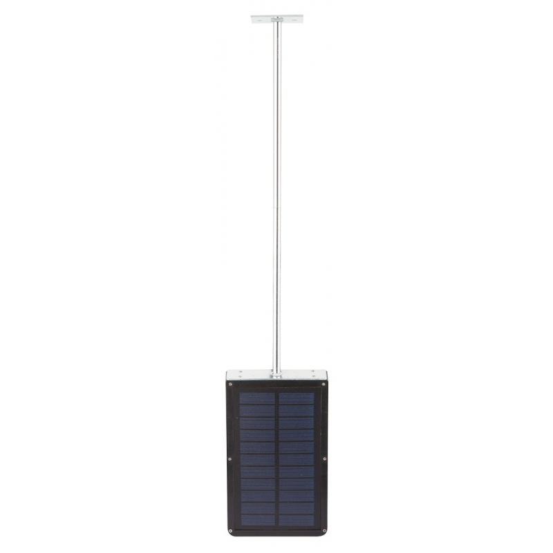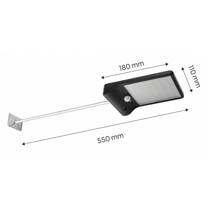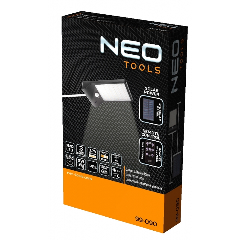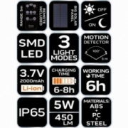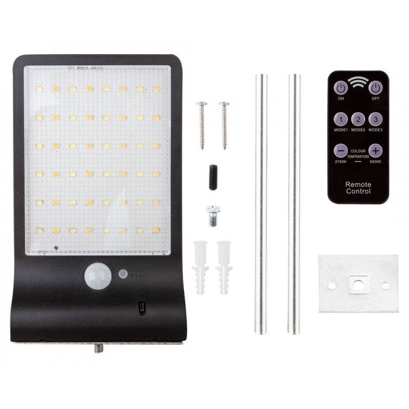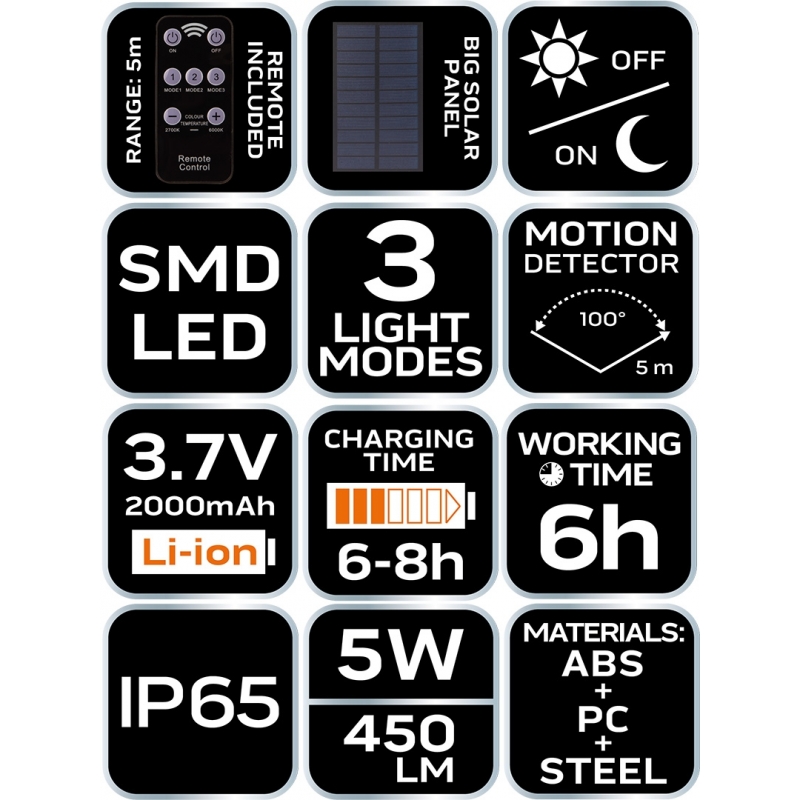 Lampa solarna uliczna SMD LED, pilot, zasięg pilota 5m, 450 lm, 5W, 3 funkcje świecenia, akumulator li-ion 3.7V 2000mAh, czujnik zmierzchu, materiał korpusu ABS+PC i materiał uchwytu to metal, czujnik ruchu 3-5 m/100 stopni, czas pracy 6h, czas ładowania 6-8h, 3000-6000 K, IP65, panel solarny, kołki montażowe w zestawie