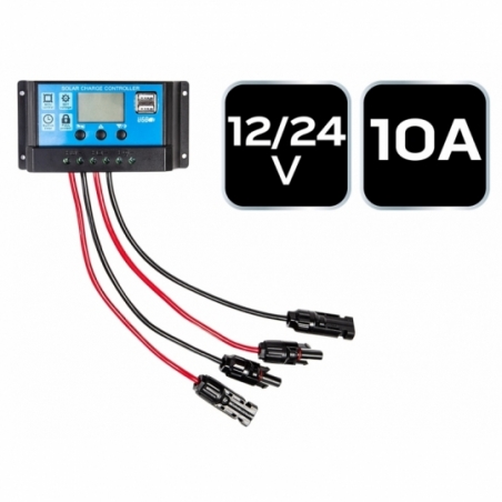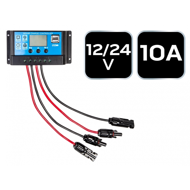 Kontroler panelu słonecznego 10A, 12/24V. Kontroler napięcia jest dedykowany do wszystkich typów akumulatorów kwasowo ołowiowych. Nadaje się do litowo jonowe (trójskładnikowych akumulatorów litowych), jak również do akumulatorów litowo-polimerowe (litowo-żelazowo-fosforanowych). Regulator napięcia jest dedykowany tylko i wyłącznie do panela słonecznego. Nigdy nie podłączaj innych źródeł zasilania do tego regulatora. Wbudowany sterownik, pozwala na regulację parametrów; w pełni 3-stopniowe zarządzanie ładowaniem PWM; wbudowane zabezpieczenie przeciwzwarciowe, zabezpieczenie przed złą biegunowością, zabezpieczenie przed przeciążeniem; podwójna ochrona przed prądem wstecznym MOSFET; kontroler posiada funkcję obsługi akumulatora typu litowego oraz baterii kwasowo-ołowiowej (w interfejsie typu baterii, należy przytrzymać 3 sekundy przycisk ustawienia przełącznika) domyślnie ustawiony jest akumulator litowy.
