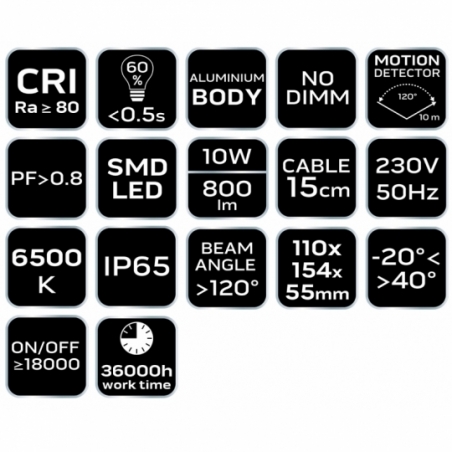 Reflektor NEO moc 10W, 800 lumenów, 230V 50Hz, SMD LED, czas pracy 36 000h, 6500K, aluminiowy korpus, IP65, CRI Ra ≥ 80, kąt świecenia 120 stopni, ON/OFF ≥ 18 000 cykli, przewód 15 cm, temperatura pracy -40 <> +50, współczynnik mocy > 0.8, czas rozpalania do 60% = 0 s, uchwyt obrotowy do powieszenia, czujnik ruchu kąt przechwytywania 120 stopni, odległość przechwytywania 10 m, możliwość ustawienia czasu pracy, czułości oraz jasności od której lampa będzie się uruchamia