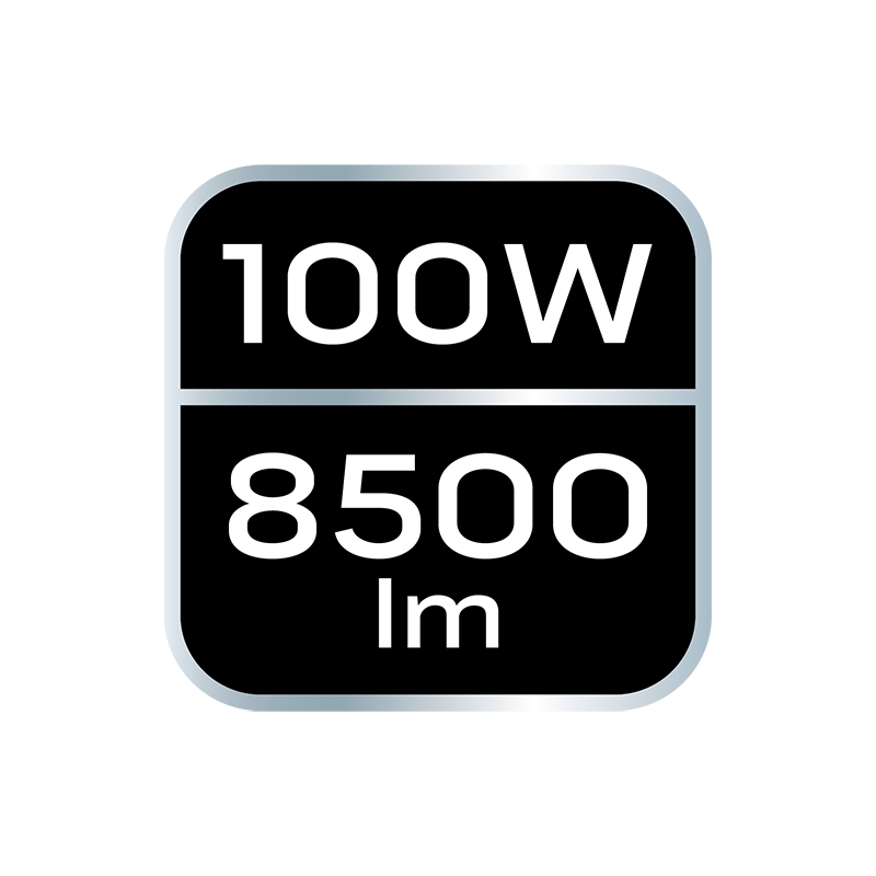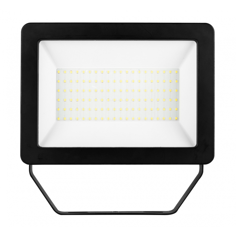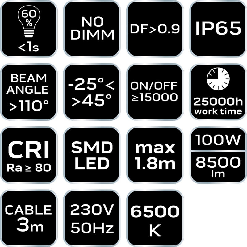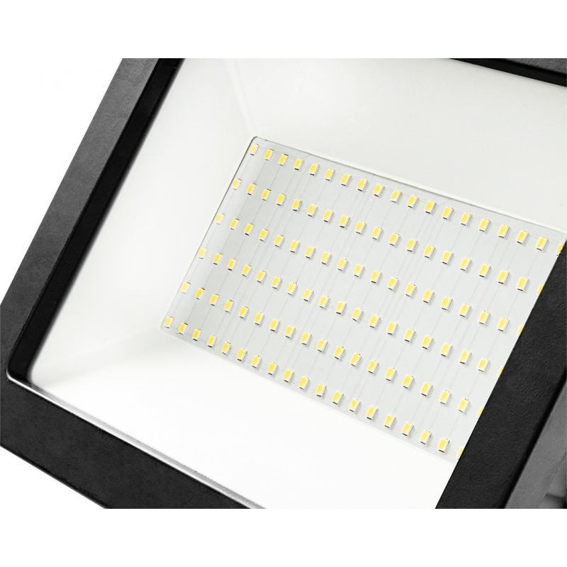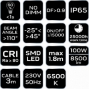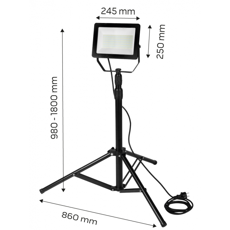 Reflektor pojedynczy NEO moc 100W, 8500 lumenów, 230V 50Hz, SMD LED, czas pracy 25 000h, 6500K, aluminiowy korpus, IP65, CRI Ra ≥ 80, kąt świecenia 110 stopni, ON/OFF ≥ 15 000 cykli, przewód z wtyczką 3m, temperatura pracy -25<>+45, współczynnik mocy >0.9, czas rozpalania do 60% <1s, statyw teleskopowy max 1.8