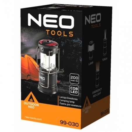 Lampa biwakowa bateryjna 3 w 1 Neo lampa, latarka, lampa ostrzegawcza, moc 3W, 200 lumenów, COB LED, zasilanie 3xAA (brak w zestawie), 2 uchwyty do przenoszenia i zawieszenia, wysuwana konstrukcja, magnesy w podstawie.