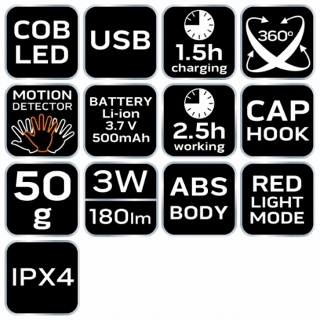 Latarka czołowa akumulatorowa USB 180 lm, 3W, COB LED, funkcja włączania na czujnik ruchu, czerwone światło, obrotowa głowica 360 stopni, waga 50g, przewód USB, akumulator li-ion 3.7V 500mAh, czas ładowania 1.5h, czas pracy 2,5h, zaczep na czapkę, IPX 4, materiał korpusu ABS