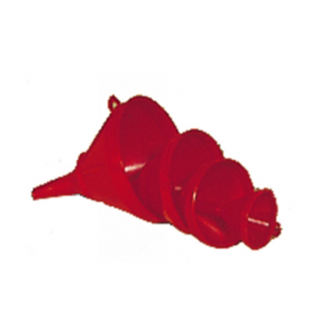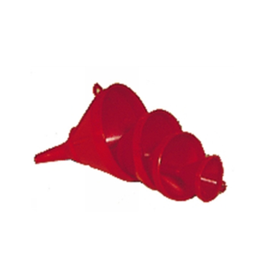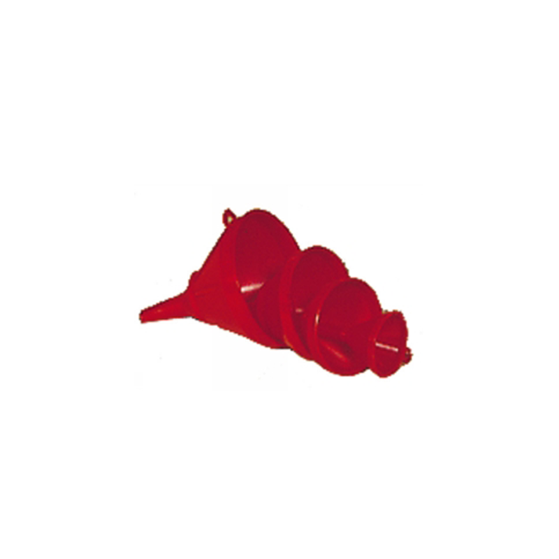 Zestaw lejków z twardego polipropylenu, składający się z produktów nr TR-50, TR-70, TR-100 i TR-120, przeznaczony do oleju, benzyny, produktów naftowych i innych substancji chemicznych.
