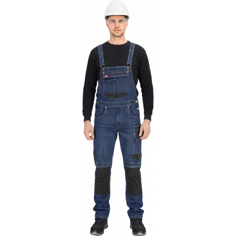 RAW-POL JEANS303‑B to elastyczne męskie spodnie ochronne ogrodniczki marki REIS, wykonane z lekkiej tkaniny jeansowej z dodatkowymi wzmocnieniami Cordura 500D. Wyposażone w liczne kieszenie, kieszenie na nakolanniki, uchwyt na młotek oraz elementy odblaskowe — idealne do pracy w logistyce, budownictwie, przemyśle i rzemiośle.