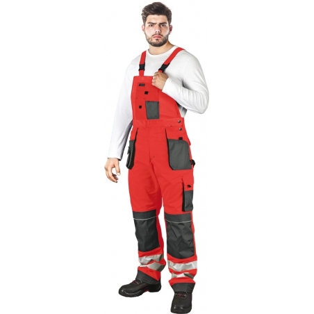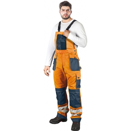 Spodnie ochronne ogrodniczki FORMEN. - 80% poliester, 20% bawełna (kolor CSB: 100% poliester) - gramatura 270 g/m2 - dwie kieszenie z tyłu na rzepy oraz dwie boczne podwójne - jedna kieszeń na nogawce na rzepy z dodatkowymi kieszonkami na akcesoria, jedna boczna podłużna oraz jedna na klatce piersiowej z kieszonkami na telefon oraz przybory - duża liczba kieszeni zwiększa funkcjonalność spodni - końcówka do przypięcia kluczy - pętelki umożliwiające doczepienie dodatkowych akcesoriów - możliwość regulacji w pasie oraz długości za pomocą szelek - guma w tylnej partii zwiększająca swobodę ruchów - na kolanach kieszenie na wkładki nakolannikowe KING BEE - na kieszeniach, kolanach oraz na dole nogawek dodatkowe wzmocnienie co zwiększa wytrzymałość spodni na przetarcia - staranne wykonanie oraz zwiększona wytrzymałość zapewniają wysoki komfort użytkowania - testowane na zawartość szkodliwych dla zdrowia substancji zgodnie ze standardami OEKO-TEX® Standard 100 - materiał i pasy testowane zgodnie z normą EN20471