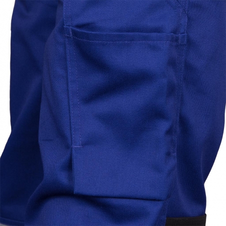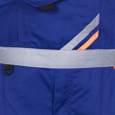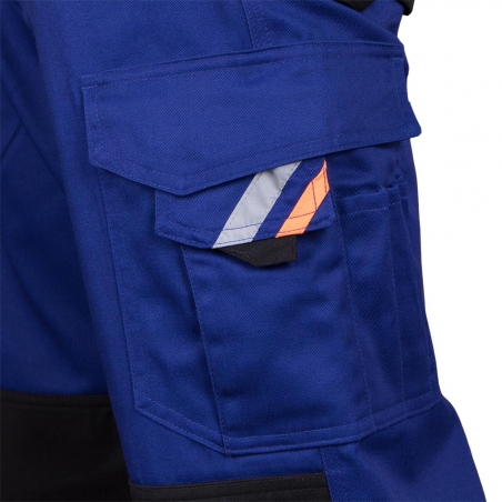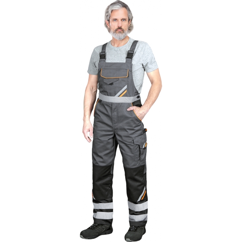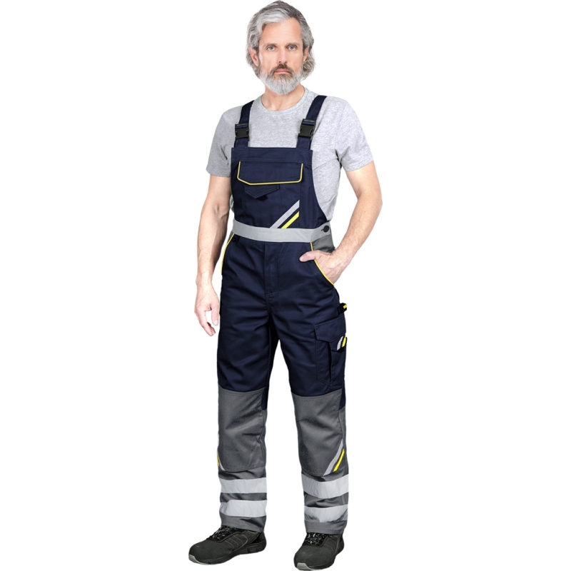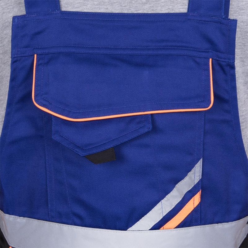 RAW-POL PROM‑B to męskie spodnie ochronne typu ogrodniczki wykonane z trwałej tkaniny poliestrowo‑bawełnianej z kontrastowymi wstawkami. Wyposażone w liczne kieszenie, regulowane szelki, kieszenie na nakolanniki oraz pasy odblaskowe — idealne do pracy w warunkach wymagających widoczności i funkcjonalności.