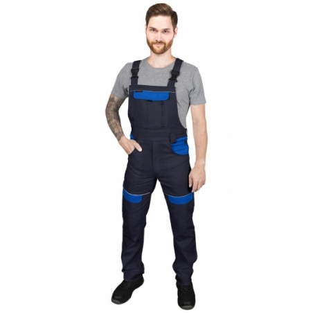 RAW-POL CORTON-B to męskie spodnie ochronne typu ogrodniczki wykonane w 100% z bawełny o gramaturze 260 g/m². Wyposażone w podwójną kieszeń na klatce piersiowej, kieszenie boczne, tylne zapinane na rzep oraz kieszenie narzędziowe na nogawkach. Regulacja długości za pomocą szelek z gumką z tyłu oraz ściągacz w pasie i guziki zapewniają wygodę i dopasowanie. Fason REGULAR z elementami odblaskowymi zwiększającymi widoczność.