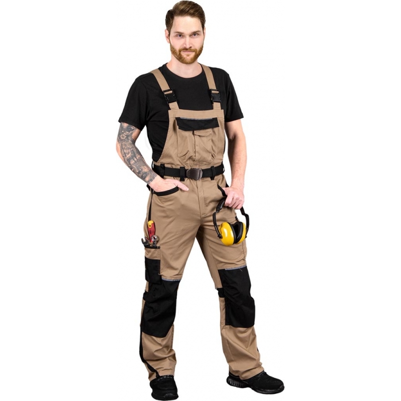 Spodnie ochronne ogrodniczki DESERT. - 97% bawełna, 3% spandex - gramatura 180 g/m2 - siateczkowe wstawki wykonane z 80% nylonu i 20% spandexu o gramaturze 170 g/m2 - dwie kieszenie na klatce piersiowej zapinane na rzep - dwie boczne kieszenie - dwie tylne kieszenie zapinane na rzep - cztery kieszenie na nogawkach, w tym dwie zapinane na rzep - gumka w pasie w tylnej partii zwiększa swobodę ruchów oraz umożliwia lepsze dopasowanie - możliwość regulacji długości za pomocą szelek, które to dodatkowo mają w tylnej partii gumkę - na kolanach kieszenie na wkładki nakolannikowe - odblaskowe elementy - zastosowanie siateczki wzdłuż nogawek oraz z tyłu na wysokości kolan zapewnia lepszą wentylację - zwiększona wytrzymałość dzięki wstawkom wykonanym z materiału Cordura - uchwyt na młotek na lewej nogawce - idealne na upalne dni