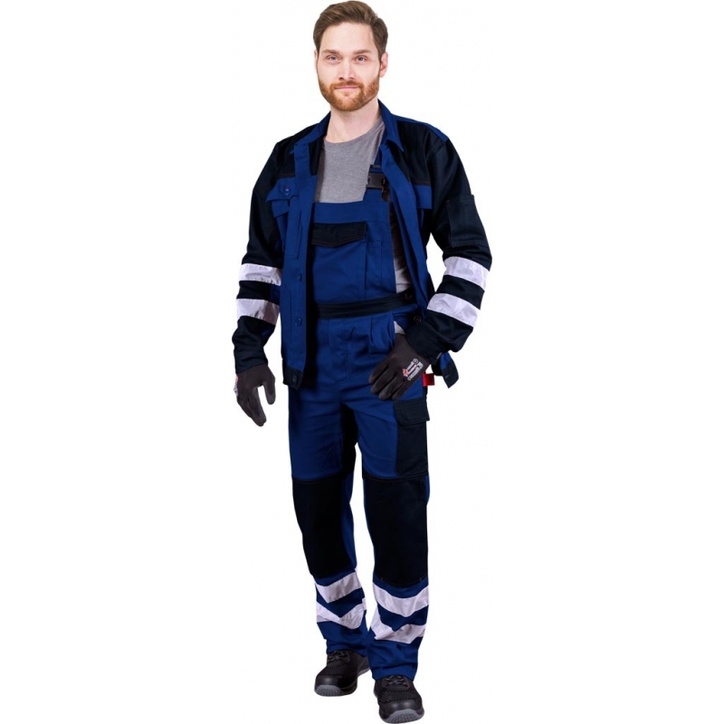 Spodnie ochronne ogrodniczki BOMULLX. - tkanina: 100% bawełna - gramatura 260-270 g/m2 - ściągacz w pasie oraz guziki umożliwiają regulację co pozwala na lepsze dopasowanie - możliwość regulacji długości za pomocą szelek - sześć kieszeni: dwie boczne, dwie tylne na rzep oraz dwie na nogawkach - dodatkowo trzy kieszenie w górnej partii spodni, w tym jedna na rzep - duża liczba kieszeni zwiększa funkcjonalność spodni - na kolanach kieszenie na wkładki nakolannikowe - pasy odblaskowe zapewniają lepszą widoczność