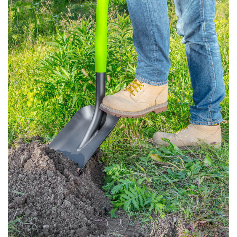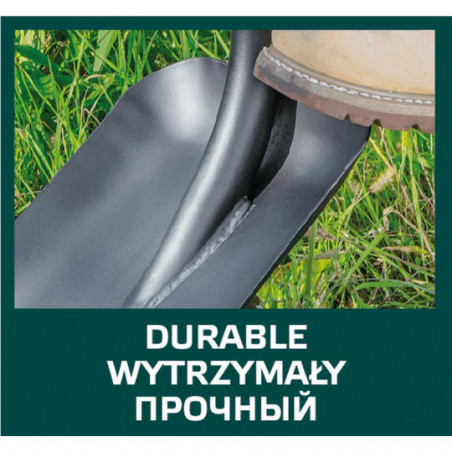Łopata piaskowa, metalowy trzonek, hartowana głowica, rękojeść z tworzywa sztucznego, długość całkowita 1300 mm.