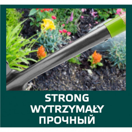 Szpadel do sadzonek, drewniany trzonek, hartowana głowica, rękojeść z tworzywa sztucznego, długość całkowita 1280 mm.