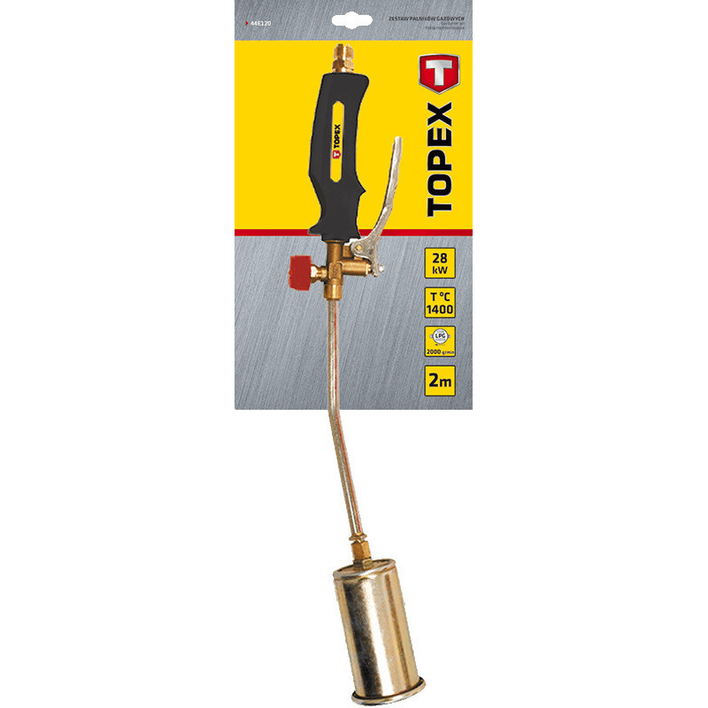 Zestaw palników gazowych 28kW, 1 palnik, wąż 1.5 m, dł. lancy 25 cm, temperatura pracy 1400°C, średnie zużycie gazu 2000 g/h, masa 1.1 kg