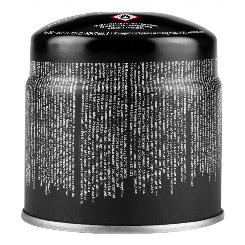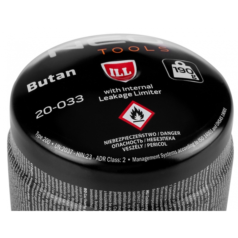 Nabój z gazem butan 190g, nabijany z systemem blokowania wypływu gazu. Zgodny z EN417