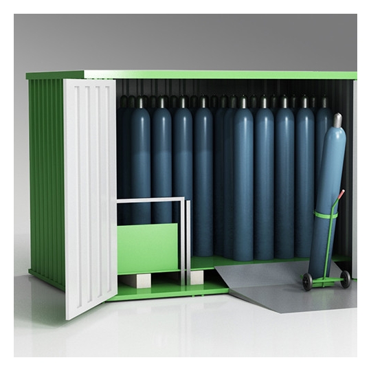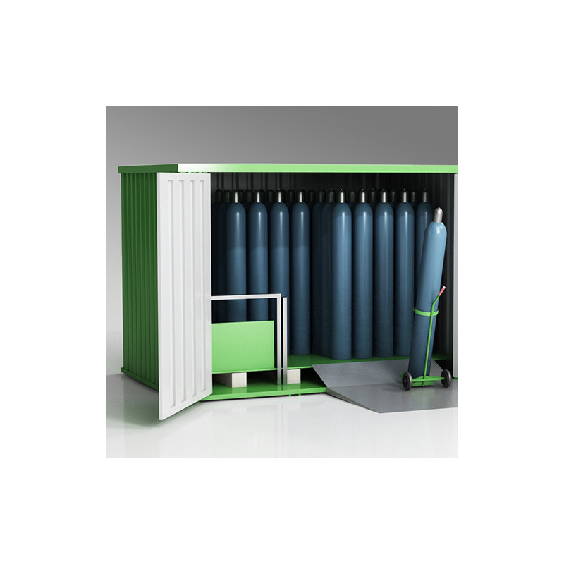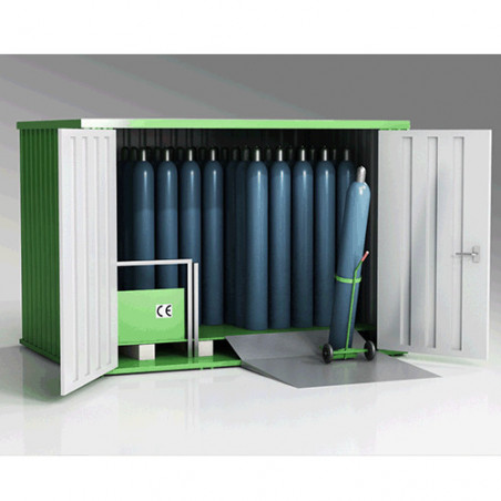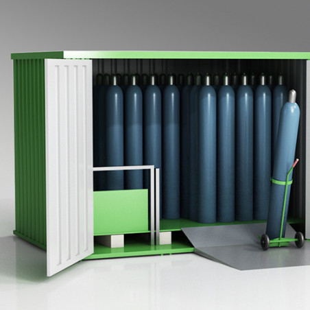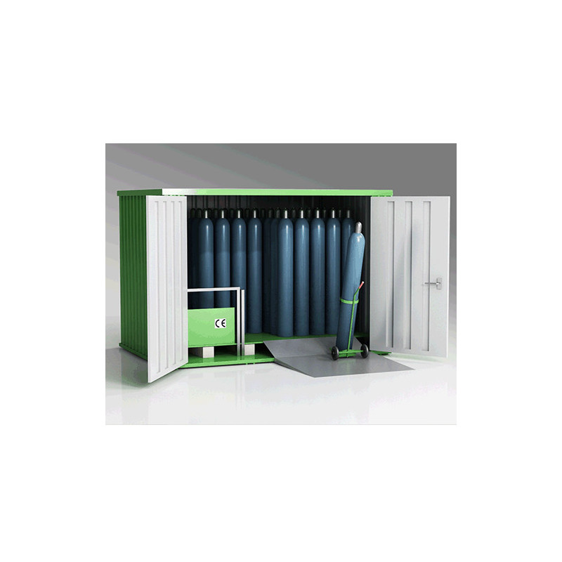 Kontener do magazynowania wewnątrz lub też na zewnątrz 58 butli z gazem. Ocynkowana blacha stalowa gwarantuje stabilną i wytrzymałą konstrukcję. Dodatkowo, materiał całkowicie odporny na korozję. Drzwi wyposażone zostały w zamek cylindryczny, by uchronić zawartość kontenera przed intruzami. Wewnątrz znajdują się specjalnie dostosowane pasy do mocowania i zabezpieczenie butli przed nieplanowanym przemieszczeniem się. Istnieje możliwość zakupu wraz z podjazdem.