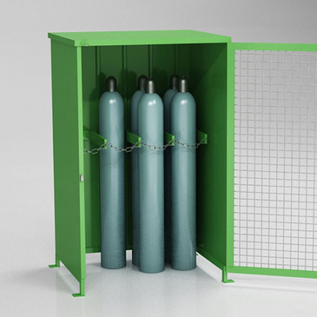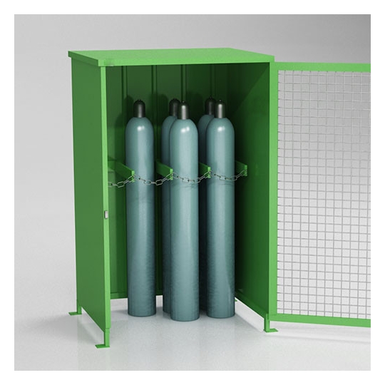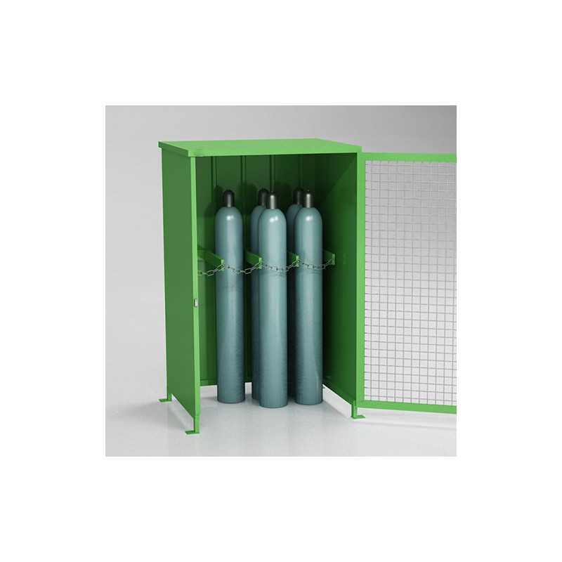 Box do przechowywania butli na zewnątrz. Szafa posiada niezwykle solidną spawaną konstrukcję sufitu i ścian pomalowanych. Naturalną wentylację zapewniają drzwi kratowe. W środku specjalne uchwyty łańcuchowe chronią butle przed niespodziewanym przemieszczaniem się. Dodatkowo szafa posiada stabilne mocowania do podłoża.