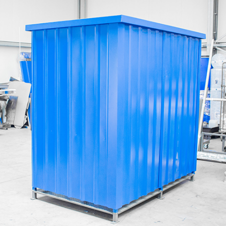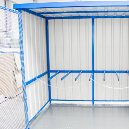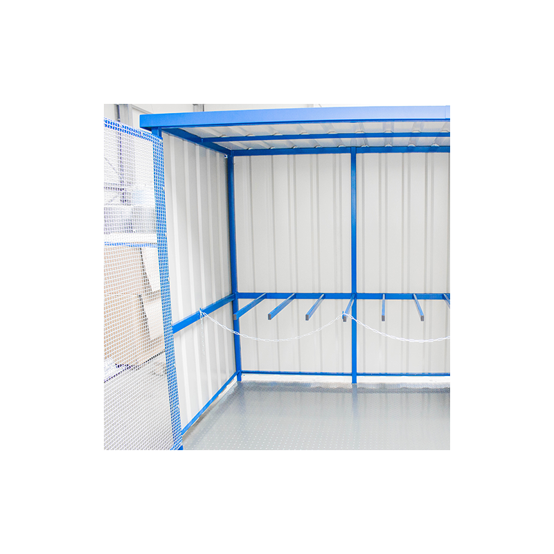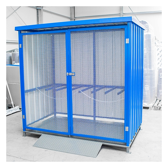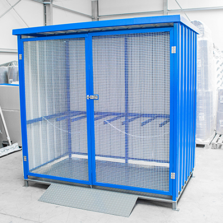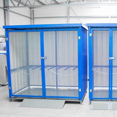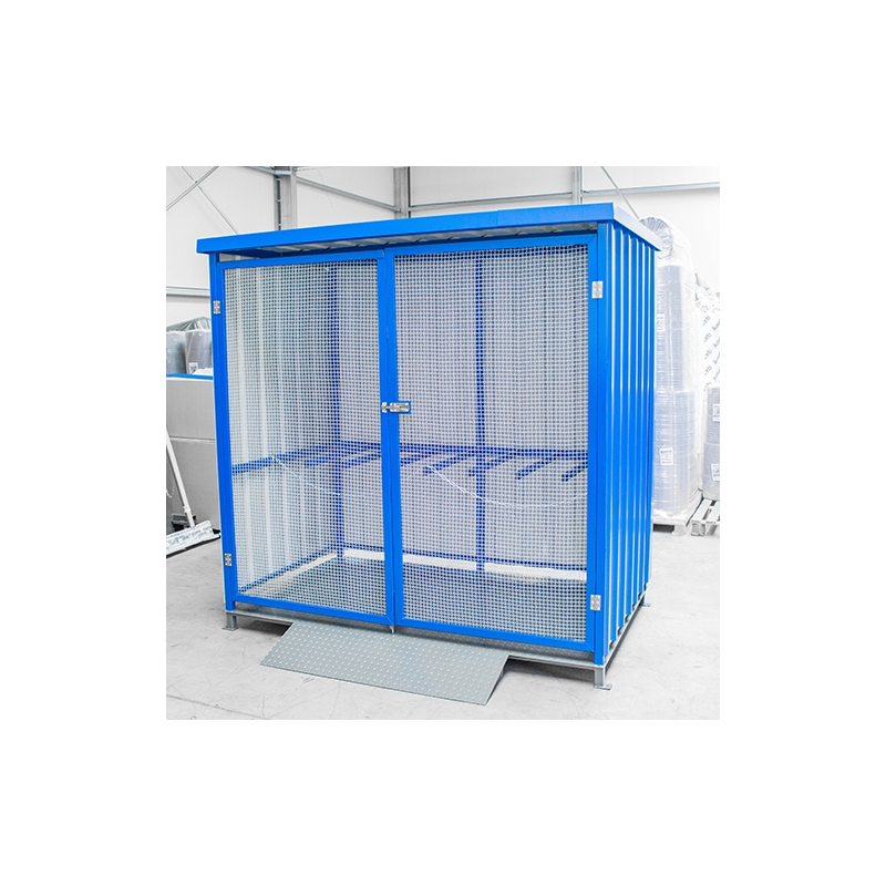 Box do przechowywania butli z gazem na zewnątrz. Szafa posiada niezwykle solidną spawaną konstrukcję sufitu i ścian pomalowanych. Naturalną wentylację zapewniają drzwi kratowe. W środku specjalne uchwyty łańcuchowe chronią butle przed niespodziewanym przemieszczaniem się. Dodatkowo szafa posiada stabilne mocowania do podłoża oraz montaż płaskowników i łańcuszków do zabezpieczenia każdej butli z osobna + stopki do podjazdu. Box z 3 stron pełny, drzwi siatka.