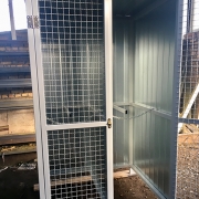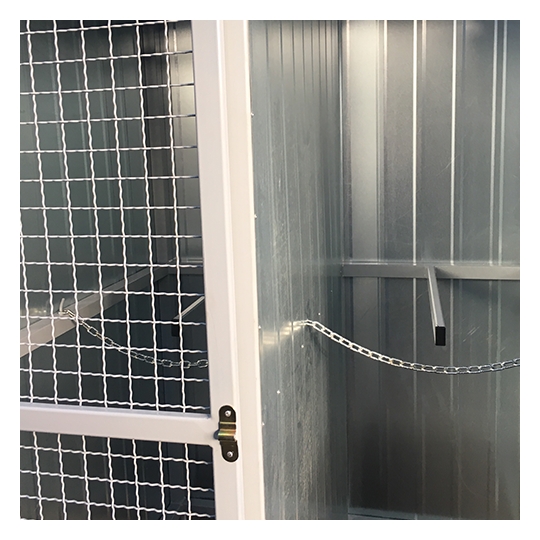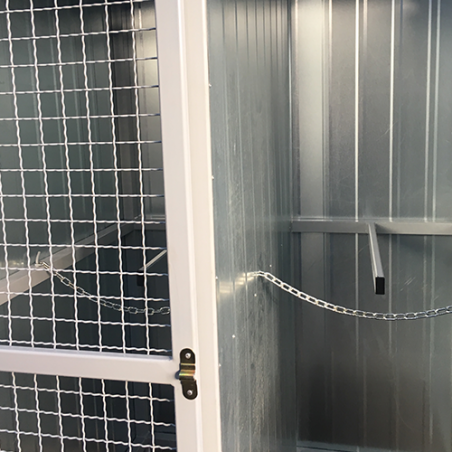 Box do przechowywania butli z gazem na zewnątrz. Niezwykle wytrzymała, spawana konstrukcja sufitu i ścian bocznych, pomalowana. Naturalną wentylację zapewniają drzwi kratowe. W środku specjalnie dostosowane uchwyty z łańcucha, by uchronić butle przed przemieszczaniem się. Szafa wyposażona w uchwyty, które gwarantują stabilne mocowanie do podłoża. Dodatkowo istnieje możliwość zamontowania podłoża, by uchronić butle przed zgubnym wpływem warunków atmosferycznych. Box przedzielony ścianką z blachy tak aby można było osobno przechowywać 2 butle pełne i 2 butle puste.