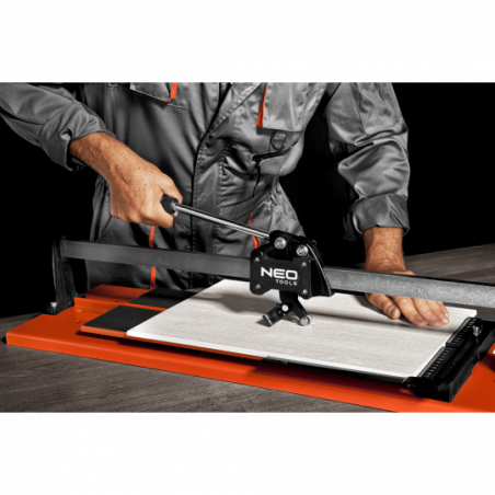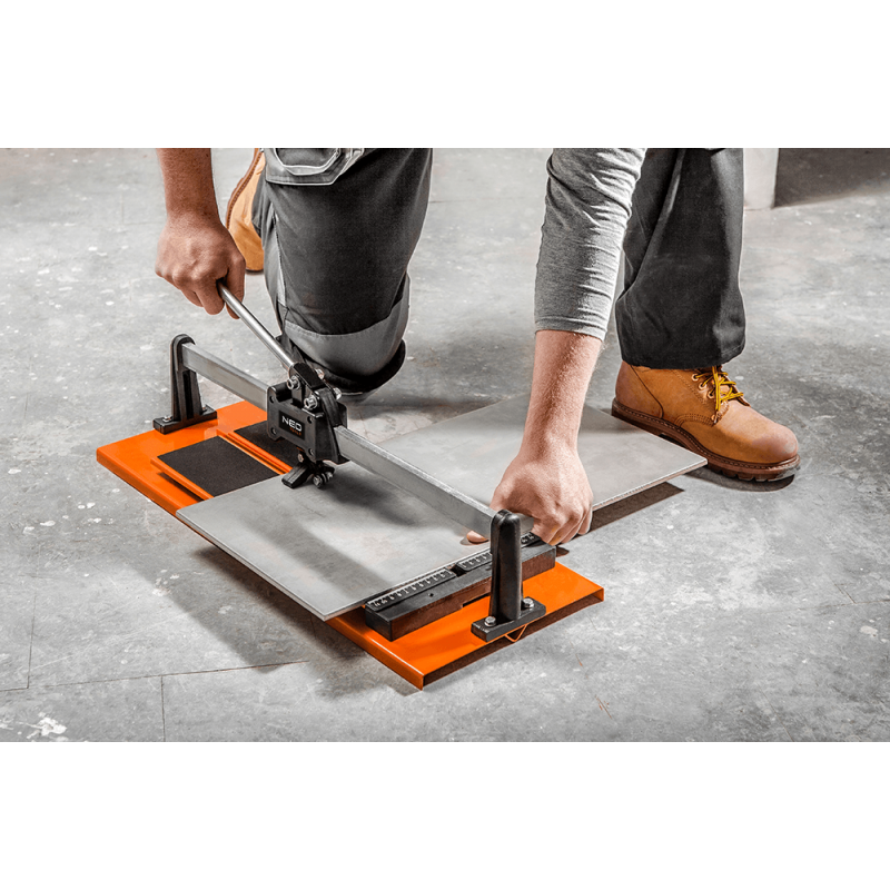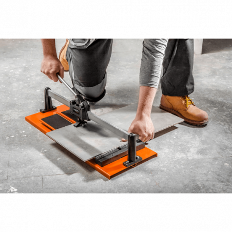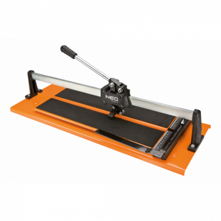 Maszynka do płytek ceramicznych 600 mm, pojedyncza prowadnica z płaskownika 30 x 12 mm, amortyzowany blat gubości 2 mm pokryty styrogumem, kółko tnące O 16 mm, łożyskowana głowica, TÜV