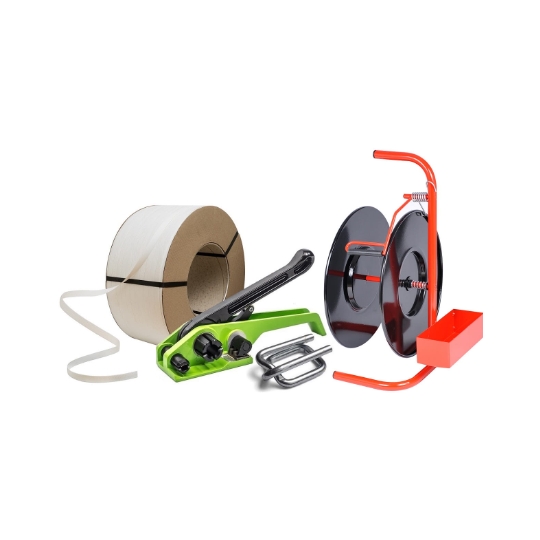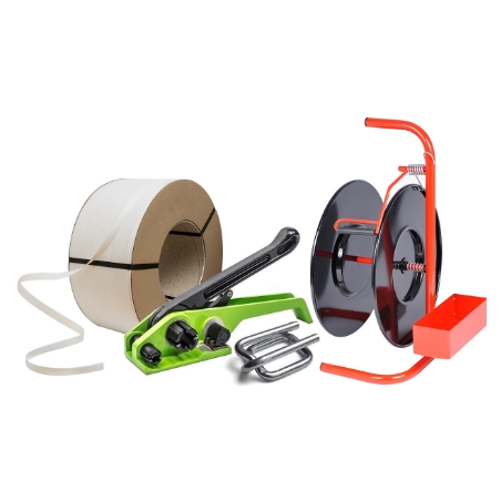 Profesjonalny system pakowania ładunków o wadze do 600,00kg. Wytrzymałość obliczono dla 5 spięć taśmą. Zestaw pakowy szeroko wykorzystywany w zakładach tartacznych, stolarskich, budowlanych, betoniarskich, gospodarstwach rolnych, sadowniczych i ogrodniczych. Wszędzie tam gdzie istnieje konieczność wiązania materiałów, które wymagają stabilizacji w trakcie ich transportu lub składowania.