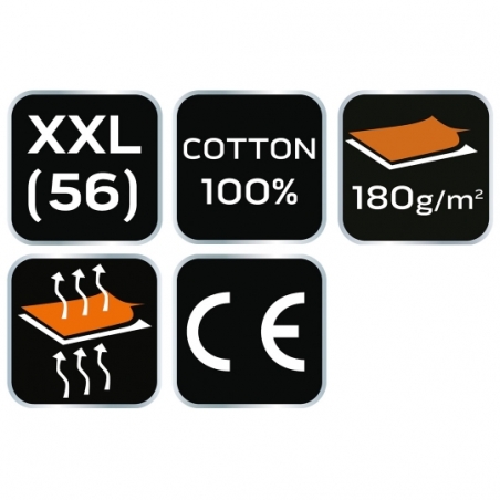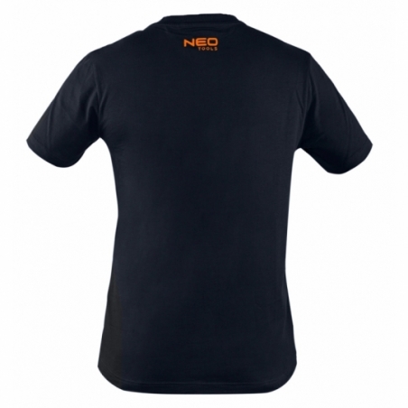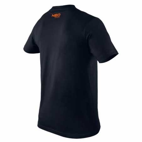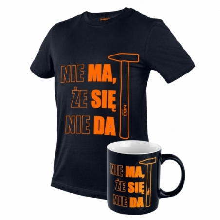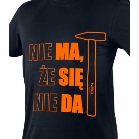 T-shirt roboczy z grafiką NIE MA ŻE SIĘ NIE DA, w ciemnogranatowym kolorze, duży neonowo pomarańczowy nadruk na przodzie, krótki rękaw, 100% bawełna, gramatura 180g/m2, nadruk: neonowo pomarańczowy napis "NIE MA, ŻE SIĘ NIE DA", słowa "NIE ŻE NIE" obrys, słowa "MA SIĘ DA" wypełnienie, rysunek młotka NEO z logiem, na karku logo NEO, unikalny projekt własny, certyfikat CE, rozmiar M