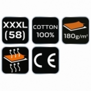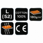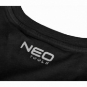 T-shirt roboczy z grafiką MOTO Expert, w czarnym kolorze, nadruk na przodzie, 100% bawełna, gramatura 180g/m2, nadruk: klucze NEO, koło oraz tłok w skali szarości, z przodu grafika tabliczki na pomarańczowym tle z napisem "MOTO Expert", unikalny projekt własny, certyfikat CE, rozmiar M