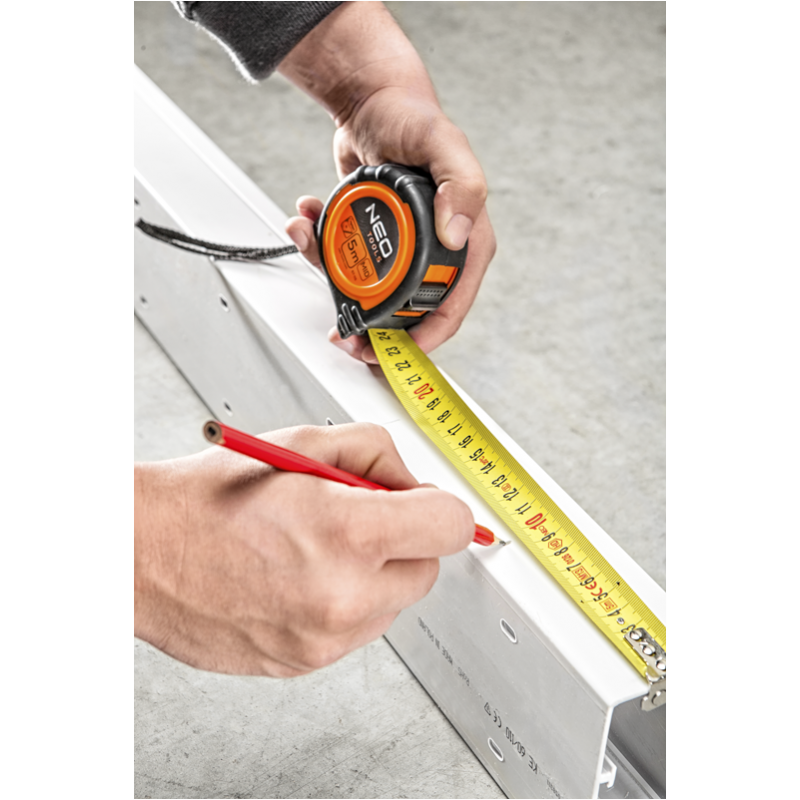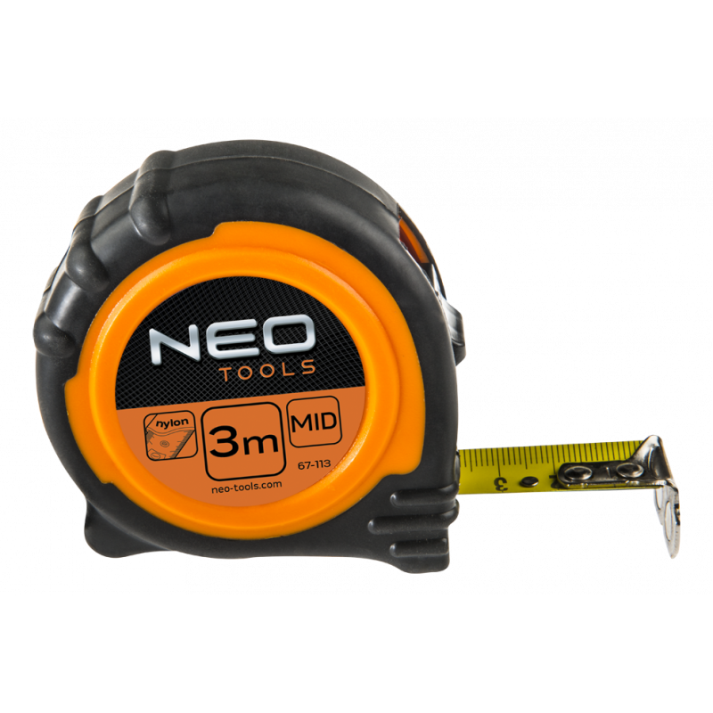 Miara zwijana stalowa 3 m x 19 mm, magnetyczna końcówka, 2 blokady zwijania taśmy, dwumateriałowa obudowa, nylonowa powłoka chroniąca podziałkę przed starciem, amortyzator zwijania taśmy, certyfikat MID