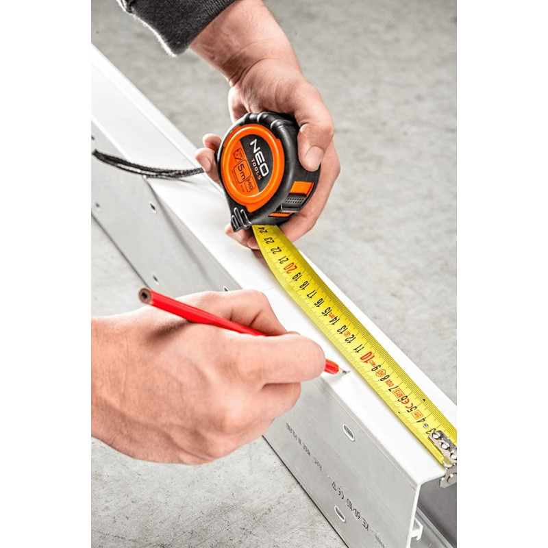 Miara zwijana stalowa 5 m x 25 mm, magnetyczna końcówka, 2 blokady zwijania taśmy, dwumateriałowa obudowa, nylonowa powłoka chroniąca podziałkę przed starciem, amortyzator zwijania taśmy, certyfikat MID