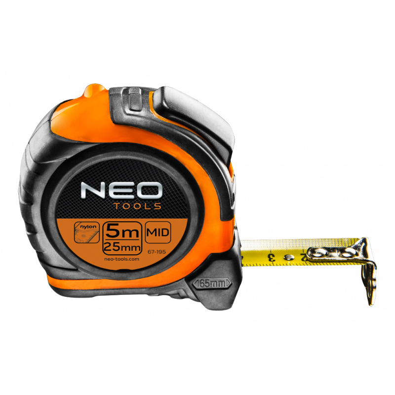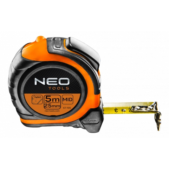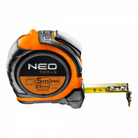 Miara zwijana stalowa 5 m x 25 mm, magnetyczna końcówka, obustronny nadruk, blokady zwijania taśmy, dwumateriałowa obudowa, nylonowa powłoka chroniąca podziałkę przed starciem, amortyzator zwijania taśmy, certyfikat MID