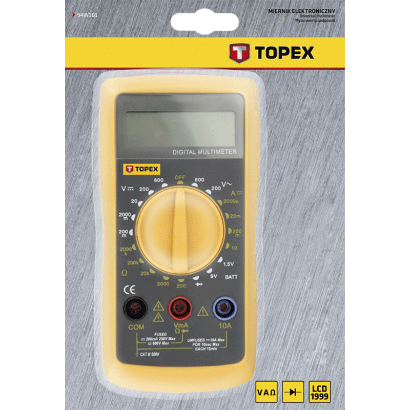 Miernik elektroniczny uniwersalny, funkcja pomiaru: napięcia prądu przemiennego, napięcia prądu stałego, wartość prądu stałego, rezystancji, pomiar diody, tester baterii 1.5V, 9V, CE
