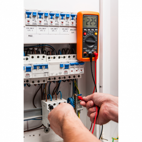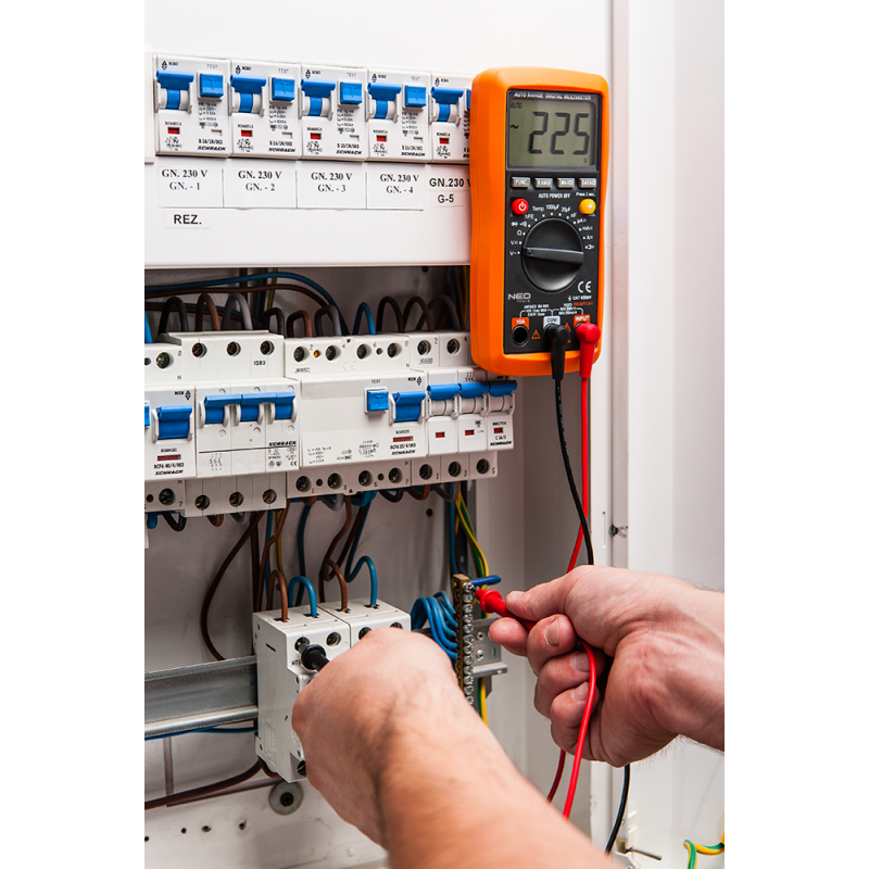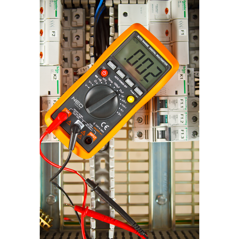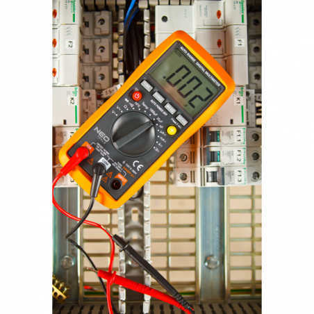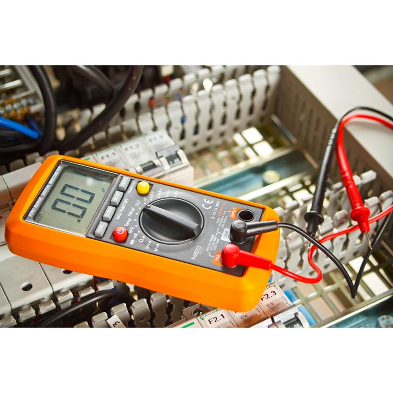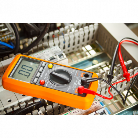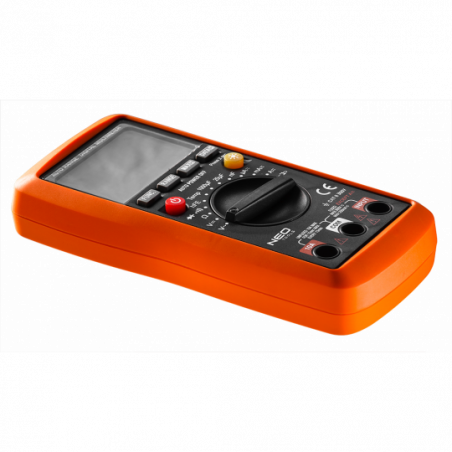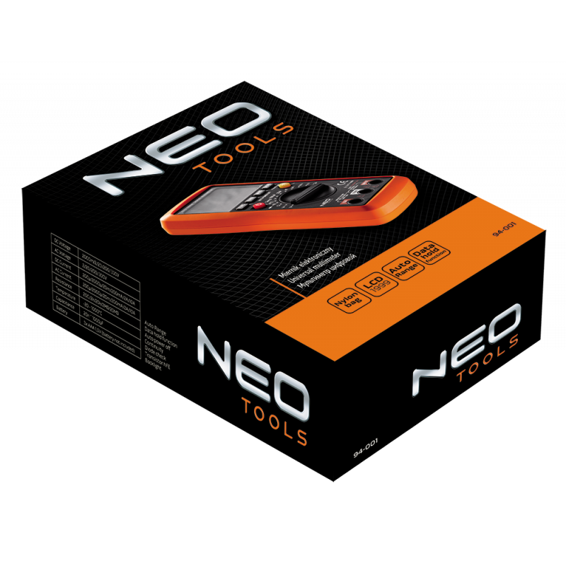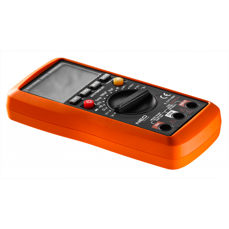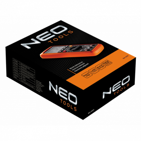 Miernik elektroniczny uniwersalny, funkcja pomiaru: napięcia prądu przemiennego, napięcia prądu stałego, natężenie prądu przemiennego, natężenie prądu stałego, rezystancji, temperatury, pojemności, hFE (tester tranzystorów), pomiar diody, ciągłości, podświetlenie wyświetlacza LCD, 3,5 cyfry, automatyczne zakresy pomiarowe, zatrzymanie (pamięć) pomiaru, nylonowy pokrowiec, CE