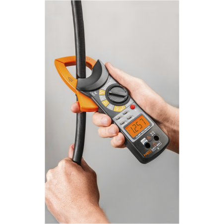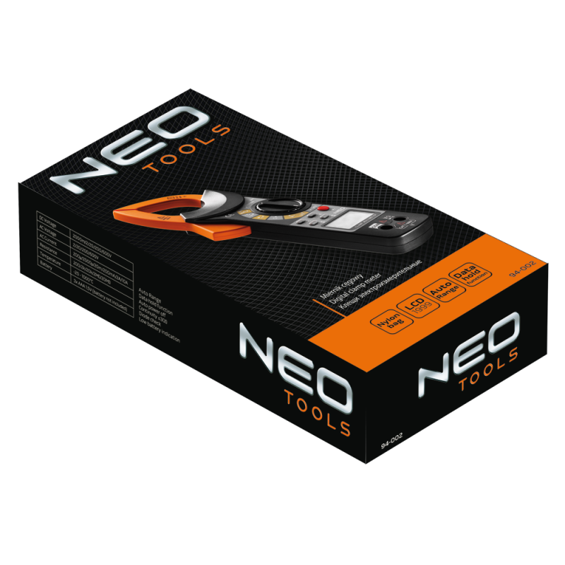 Miernik cęgowy, funkcja pomiaru: napięcia prądu przemiennego, napięcia prądu stałego, wartości prądu przemiennego, rezystancji, temeperatury, pomiar diody, ciągłości, podświetlenie wyświetlacza LCD, 3,5 cyfry, automatyczne zakresy pomiarowe, zatrzymanie (pamięć) pomiaru, nylonowy pokrowie, CE
