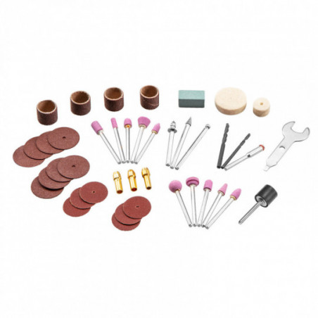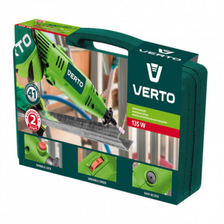 Miniszlifierka 135W, obroty 10000-35000 min⁻¹, średnica uchwytu trzpienia narzędzia roboczego1 mm/2 mm/3 mm, średnica wrzeciona M8, średnica nasadek roboczych 24 mm, (LxH) 225 x 65, masa 0.65 kg, akcesoria: 38 nasadek roboczych, 3 tuleje zaciskowe, klucz specjalny, walizka