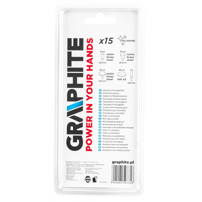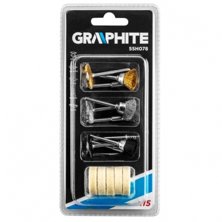 Akcesoria do miniszlifierki, szczotki druciane, mosiężne, nylonowe średnice 5, 15, 22 mm x 9 szt., filc 25 mm x 5 szt., trzpień 3.2 mm, zestaw 15 szt.