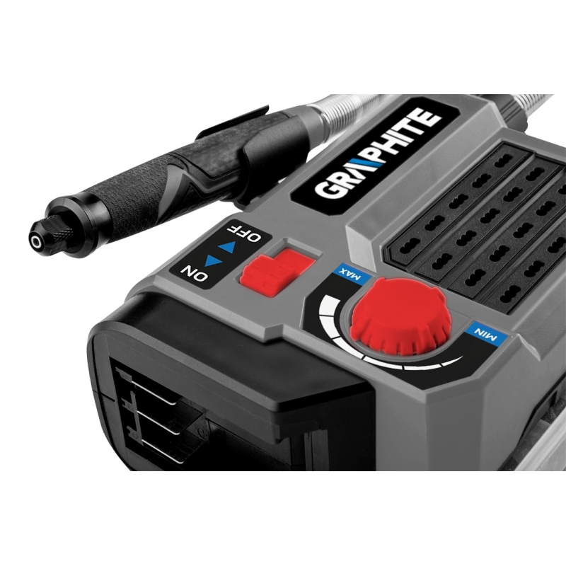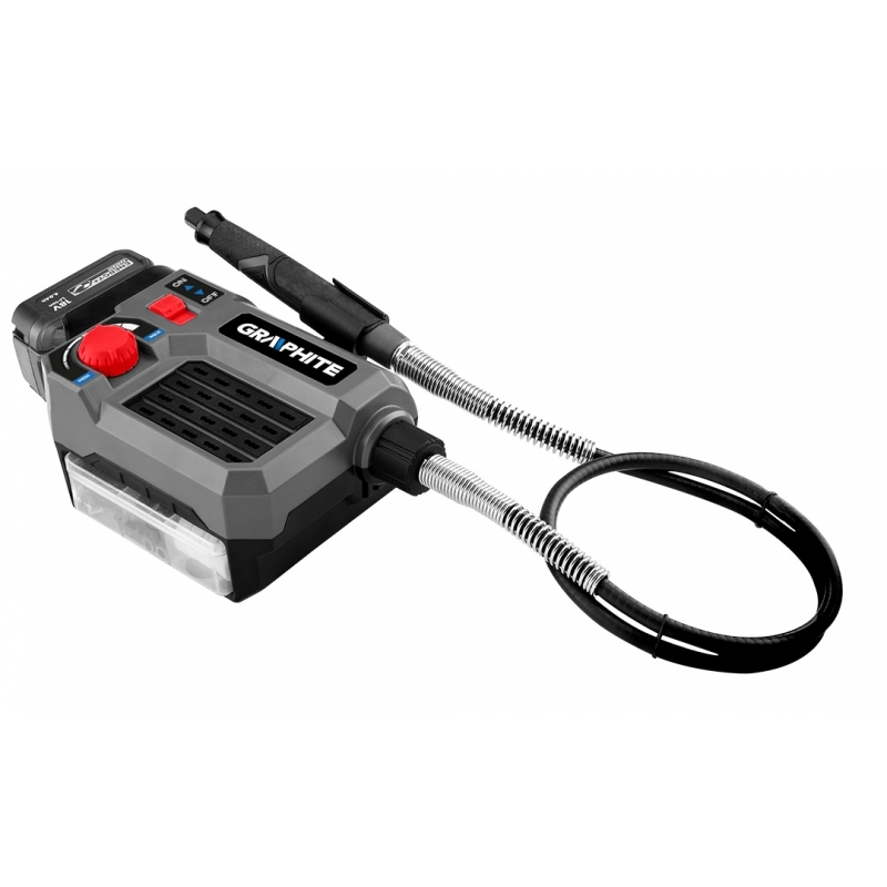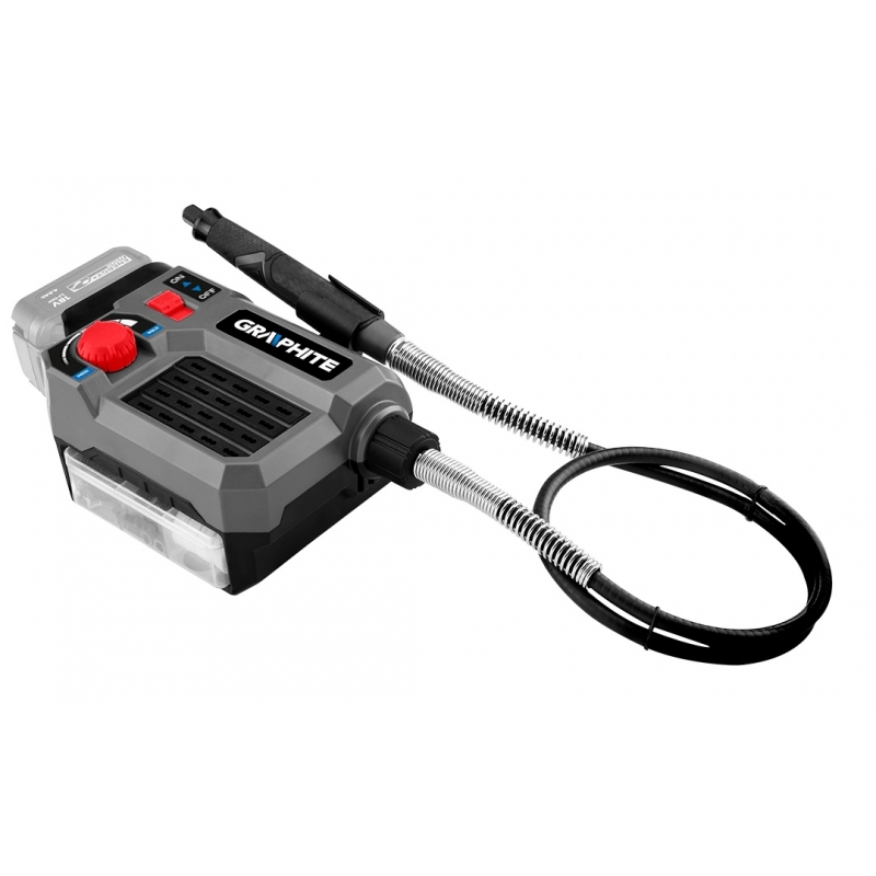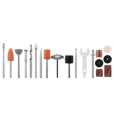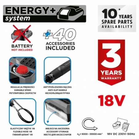Miniszlifierka akumulatorowa 18 V bez akumulatora do prac wykończeniowych: szlifowania, cięcia, grawerowania, odrdzewiania, frezowania. Prędkości obrotowa 5000 – 33000/min. Średnica wrzeciona miniszlifierki oraz średnica uchwytu wynosi 3.2 mm. Wałek giętki 1 m długości. Akcesoria: 5x tarcza tnąca, 10x sztuk papieru ściernego, 3x tarcza szlifierka z uchwytem 3.2 mm, 2x trzonek szlifierski, 6x taśma szlifierska, 1x wiertło, 3x wiertła diamentowe 3.2 mm, 2x trzpień 3.2 mm, 4x koło filcowe, 1x szczotka druciana stalowa 3.2 mm, 1x klucz płaski, 1x masa polerska, 1x obcinak Hss 3.2 mm. Waga 1,12 kg.