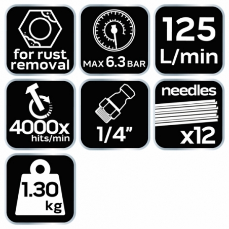 Młotek igłowy czołowy do rdzy i spawów 12 x 3 mm, ciśnienie robocze 6.3 bar, średnie zużycie powietrza 125 l/min., 4000 suw/min, złącze, 1/4", waga 1.30 kg, CE