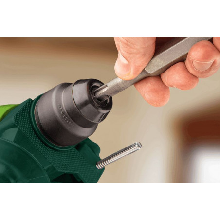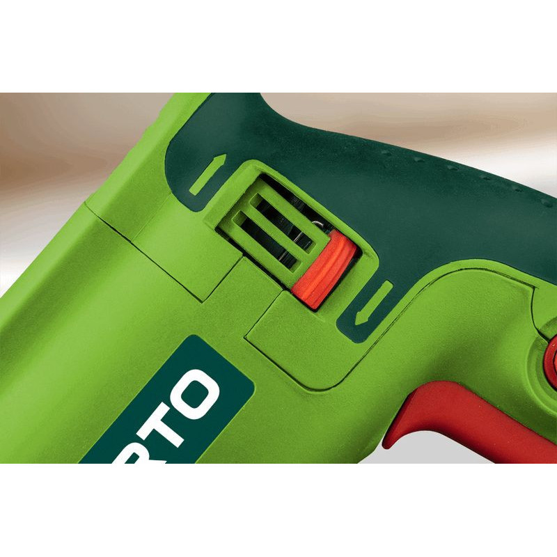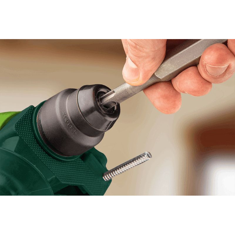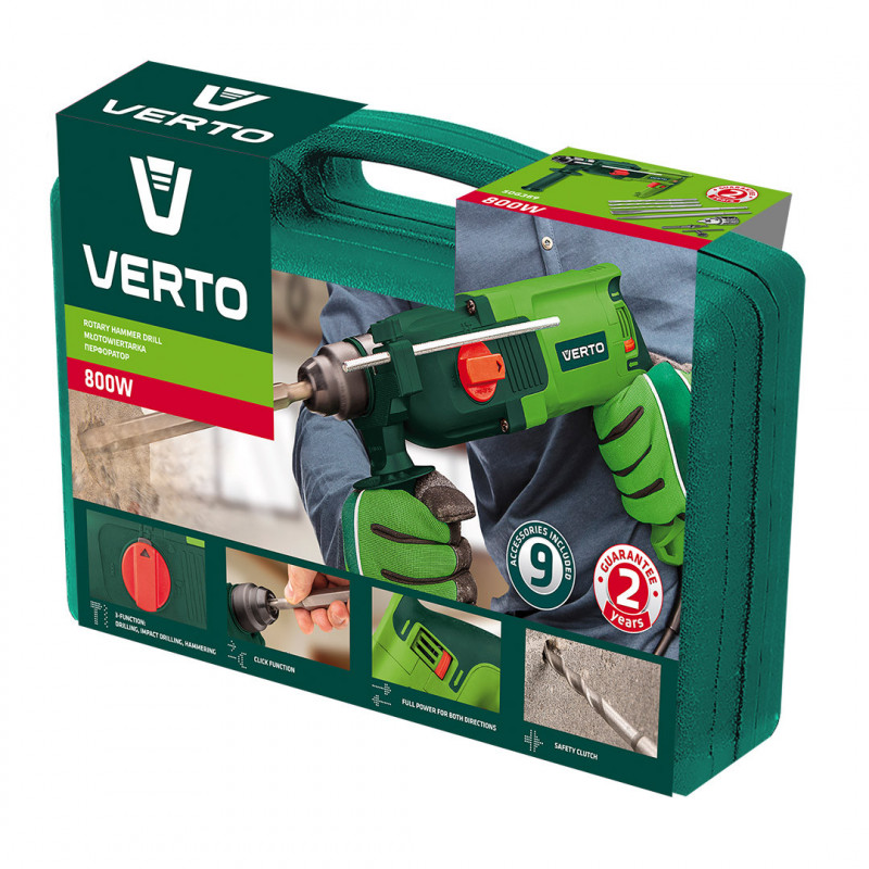 Młotowiertarka SDS+ 800W, obroty 0-930 min⁻¹, udar 0-5000 min⁻¹, prawo/lewo, energia udaru 2.8 J, 4-funkcyjna, średnica wiercenia w betonie/stali/drewnie 26/13/30 mm, (LxH) 370 x 225 mm, masa 3.26 kg, akcesoria: 3 wiertła do betonu, 2 dłuta, uchwyt wiertarski, adapter do uchwytu, walizka