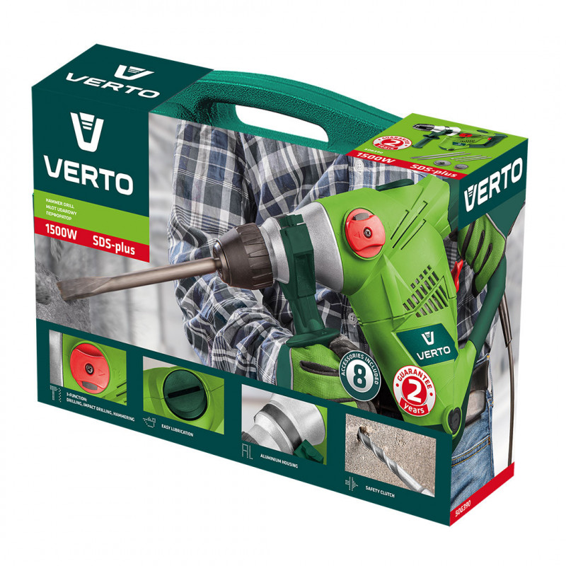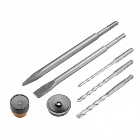 Młot udarowy SDS+ 1500W, obroty 800 min⁻¹, częstotliwość udaru: 3900 min⁻¹, energia udaru: 3,5 J, maks. średnica wiercenia w betonie: 32 mm, (LxH) 440 x 340 mm, masa 5,4 kg, walizka, akcesoria: dłuta ( punktowe i płaskie) - 2 szt., wiertła - 3 szt., rękojeść dodatkowa, osłona przeciwpyłowa, ogranicznik głębokości wiercenia