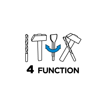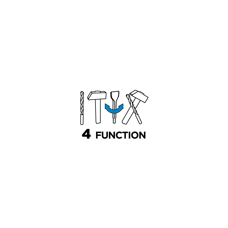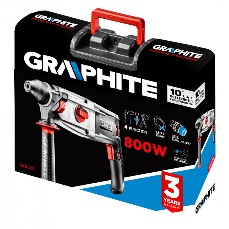 Młotowiertarka SDS+ 800W, obroty 0-1200 min⁻¹, udar 0-5300 min⁻¹, prawo/lewo, energia udaru 3.2 J, 4-funkcyjna (wiercenie, wiercenie z udarem, dłutowanie, funkcja ustawienia dłuta w dowolnym położeniu), śr. wiercenia w betonie/stali/drewnie 28/13/30 mm, przewód zasilający 2 m, blokada włącznika do pracy ciągłej, sprzęgło przeciążeniowe, ogumowana rękojeść główna, wymiary urządzenia (LxH) 390 x230 mm, masa 3.3 kg, akcesoria: 1 wiertło, listwa ogranicznika głębokości wiercenia, obrotowa rękojeść dodatkowa, uchwyt wiertarski, adapter do uchwytu, walizka