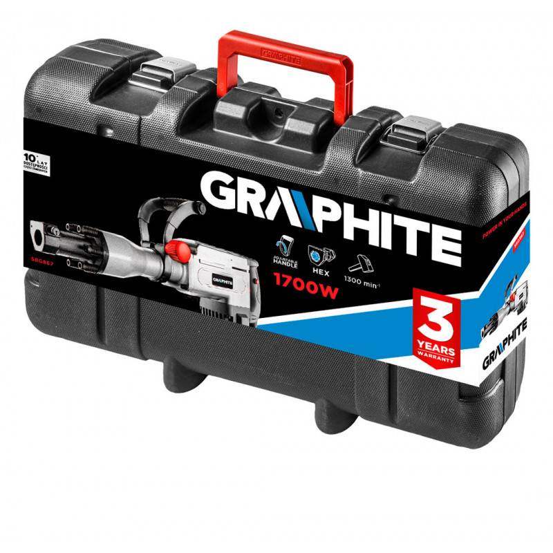 Młot wyburzeniowy uchwyt sześciokątny 30 mm, 1700W, udar 1300 min⁻¹, energia udaru 45 J, przewód zasilający 3 m, wymiary urządzenia (LxH) 750 x 225 mm, masa 17 kg, akcesoria: 1 dłuto, osłona przeciwpyłowa, zasobnik ze smarem, walizka